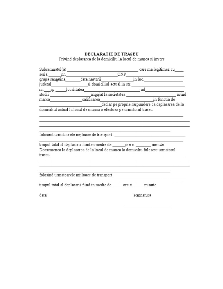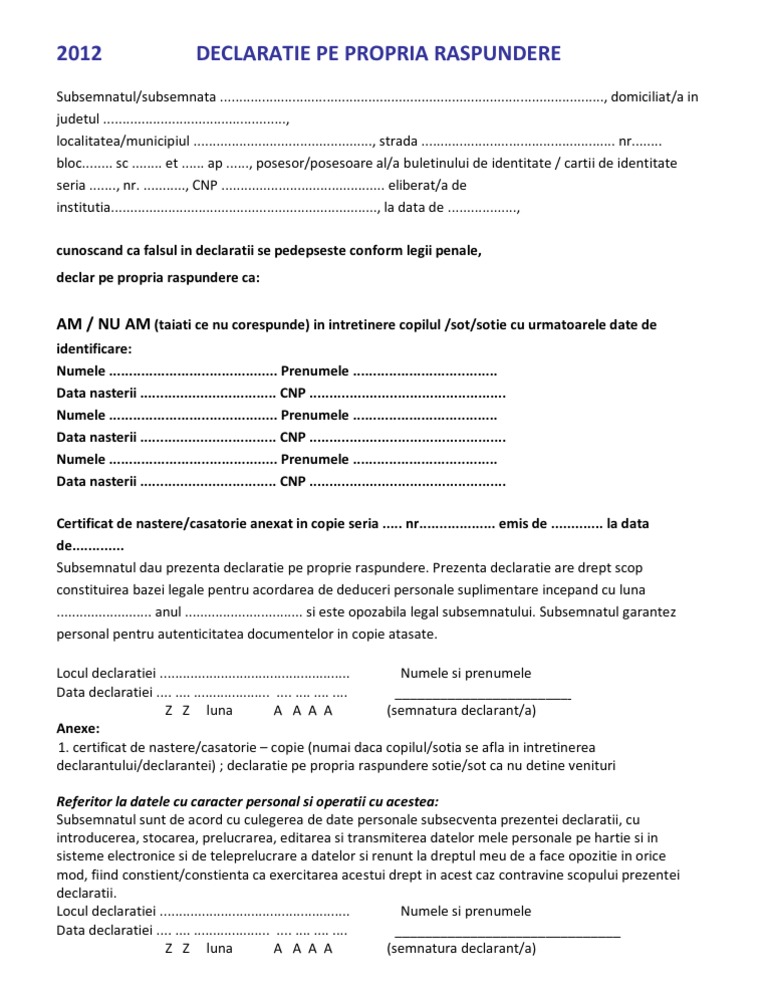 Declarație pe proprie răspundere, subsemnatul(a) _, fiul/fiica lui _ și al _, domiciliat(ă) în _, județul/sectorul.