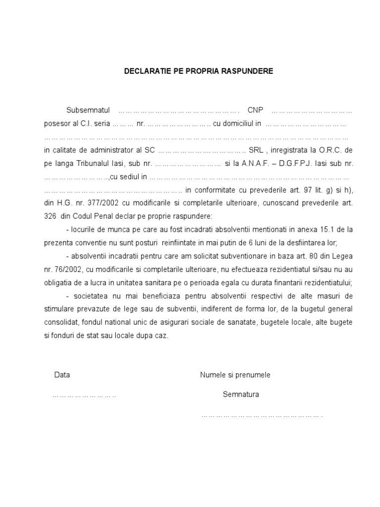 Declaratie ~ Declaratie De Conformitate Model 2020. #declaratie #regrete #tu #dor #dorinte. Ceea ce afirmă cineva cu un anumit prilej. Declar pe proprie răspundere, cunoscând prevederile articolului 326 din codul penal privind falsul în declarații. Cu reședința în fapt în: Declarație pe proprie răspundere, subsemnatul(a) _, fiul/fiica lui _ și al _, domiciliat(ă) în _, județul/sectorul.
